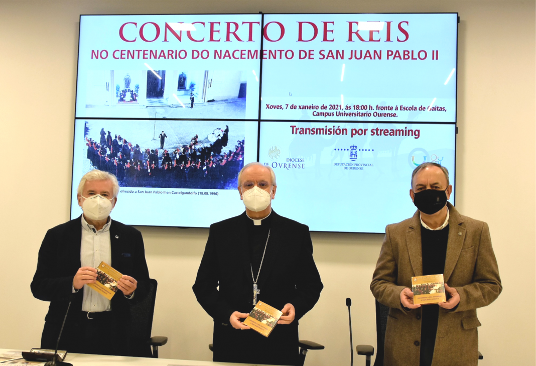 A Real Banda de Gaitas da Deputación de Ourense ofrecerá o seu tradicional “Concerto de Reis” o vindeiro xoves, 7 de xaneiro, ás 18.00 horas, no Campus universitario, fronte á Escola Provincial de Gaitas. O acto foi presentado hoxe no Pazo Provincial polo vicepresidente da Deputación de Ourense, Rosendo Fernández; o bispo de Ourense, Leonardo Lemos, e o director da Real Banda, Xosé Lois Foxo, quen coincidiron en sinalar que este evento “cultural e musical é toda unha tradición e coincide coa conmemoración do centenario do Papa san Juan Pablo II, a quen tan vencellado estivo a Real Banda”, salientou Rosendo Fernández.