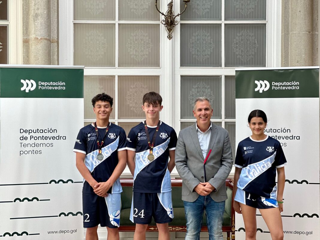 O vicepresidente da Deputación de Pontevedra, Rafa Domínguez, recibiu este mércores no Pazo provincial os deportistas pontevedreses que xogaron coa Selección Galega no Campionato de España 3×3 de Baloncesto de Seleccións Autonómicas que se disputou a pasada fin de semana en Melilla. Domínguez tivo a ocasión de felicitar a Antonio Rodríguez e a Fernando Fariña, ambos os dous do Estudiantes Pontevedra, campión en U13 masculino e subcampión en U15 masculino respectivamente, e a Noa Méndez, do CAB Pontevedra, que participou no U13 feminino.