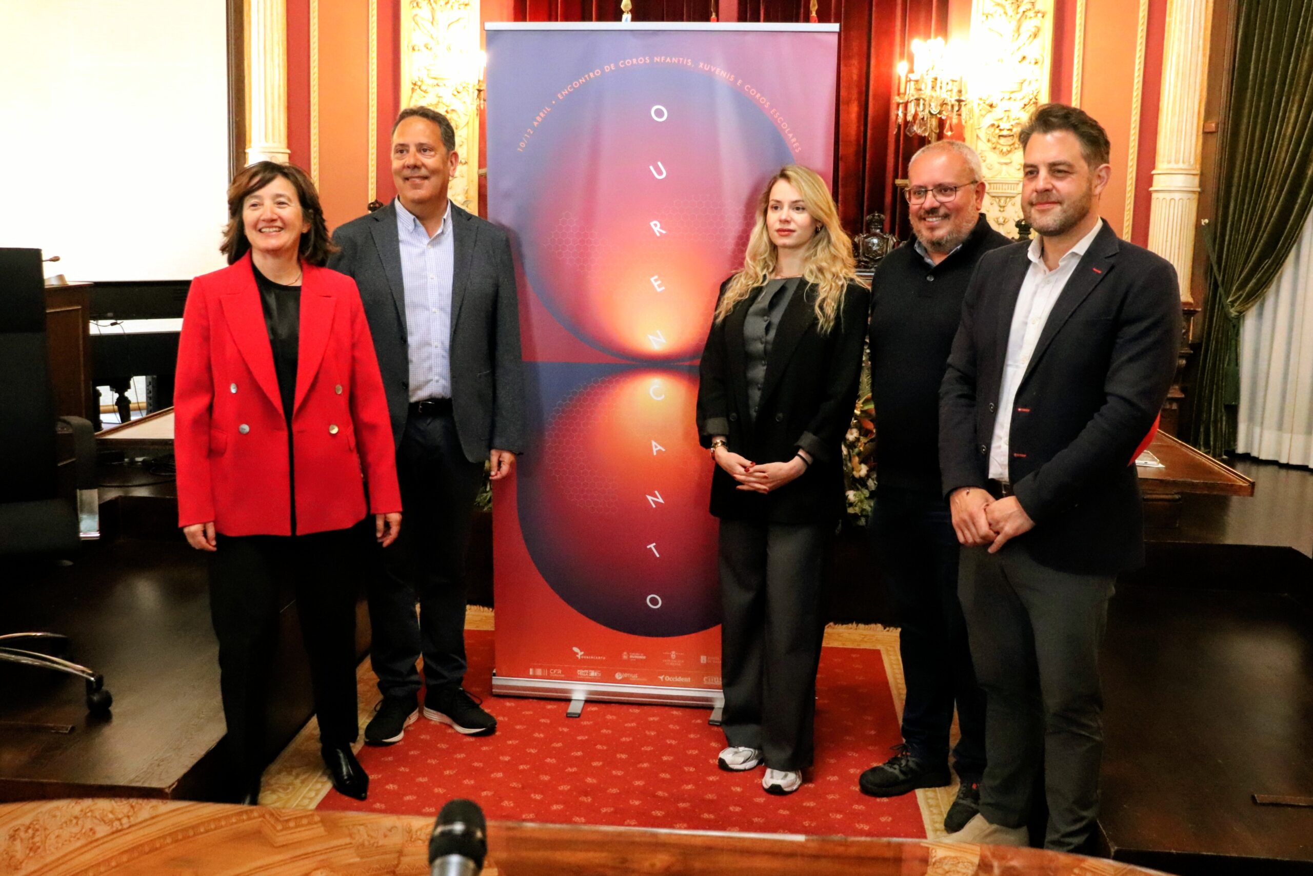 O salón de plenos acolleu esta mañá a presentación de Ourencanto 2026, nun acto no que participaron a concelleira de Artes e Festexos, Noa Rouco; a directora técnica, Cristina Rodríguez, e o produtor, Carlos Núñez; o vicepresidente segundo da Deputación, César Fernández, e o director territorial da Consellería de Educación, Jorge Sampedro.