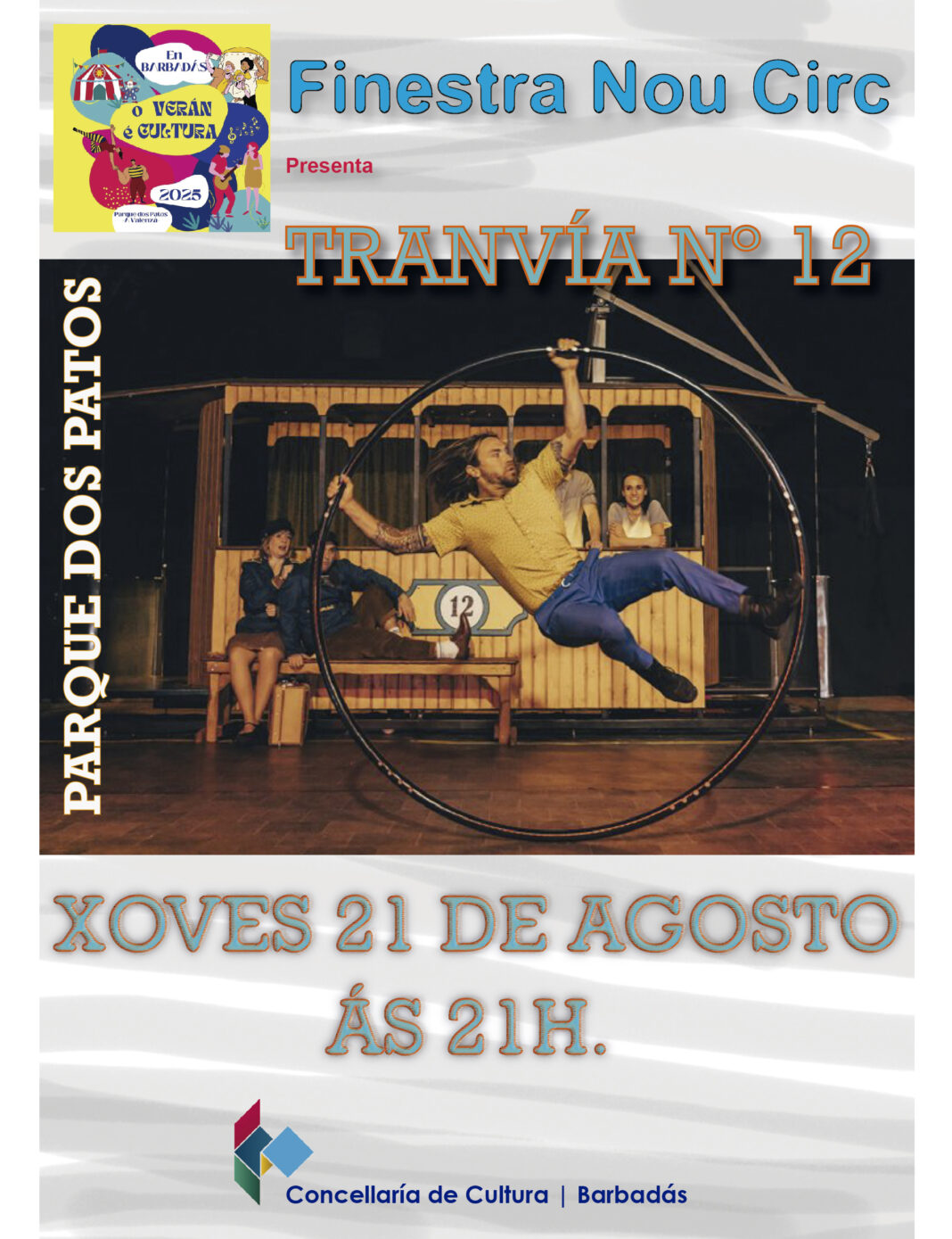 Un dos pratos fortes do Programa de Verán do concello de Barbadás chega esta semana, sera este xoves 21 de agosto ás 21h da man da compañía Valenciana LA FINESTRA NOU CIRC que vai a presentar o espectáculo “Tranvía nº12” coma sempre no Parque dos Patos (A Valenzá) organizado pola concellaría de cultura de Barbadás.