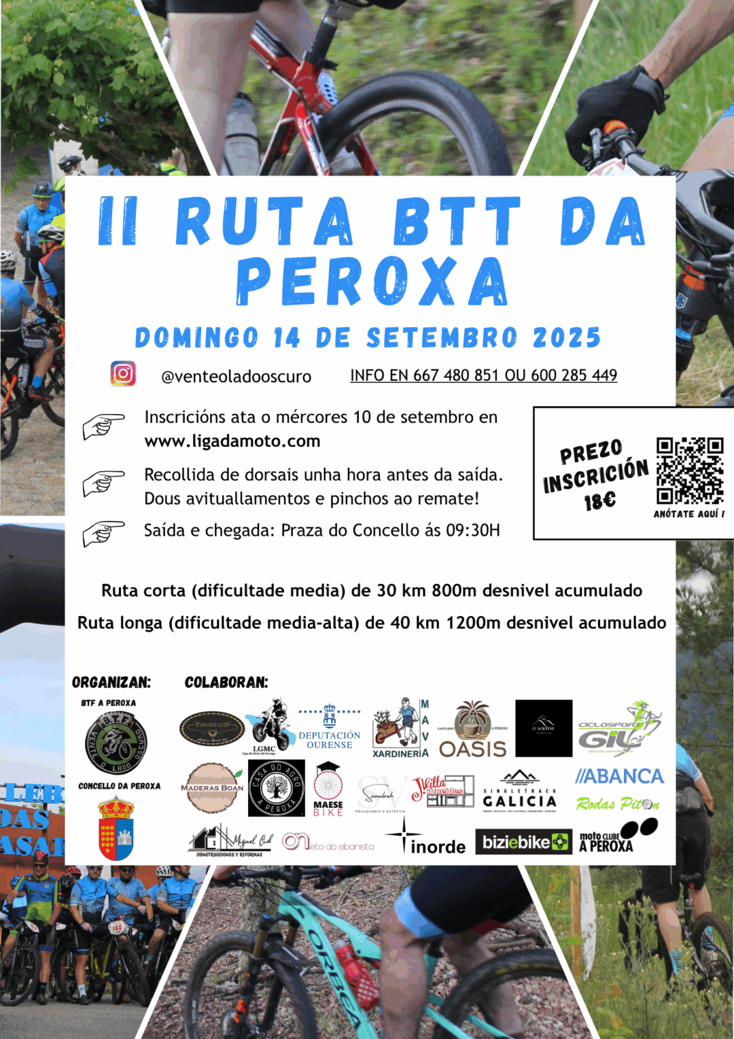 Tras o éxito do ano pasado, A Peroxa acolle a segunda edición da Ruta BTT con dous recorridos de 30 e 40 km, cun desnivel acumulado de 800m e 1200m, respectivamente.