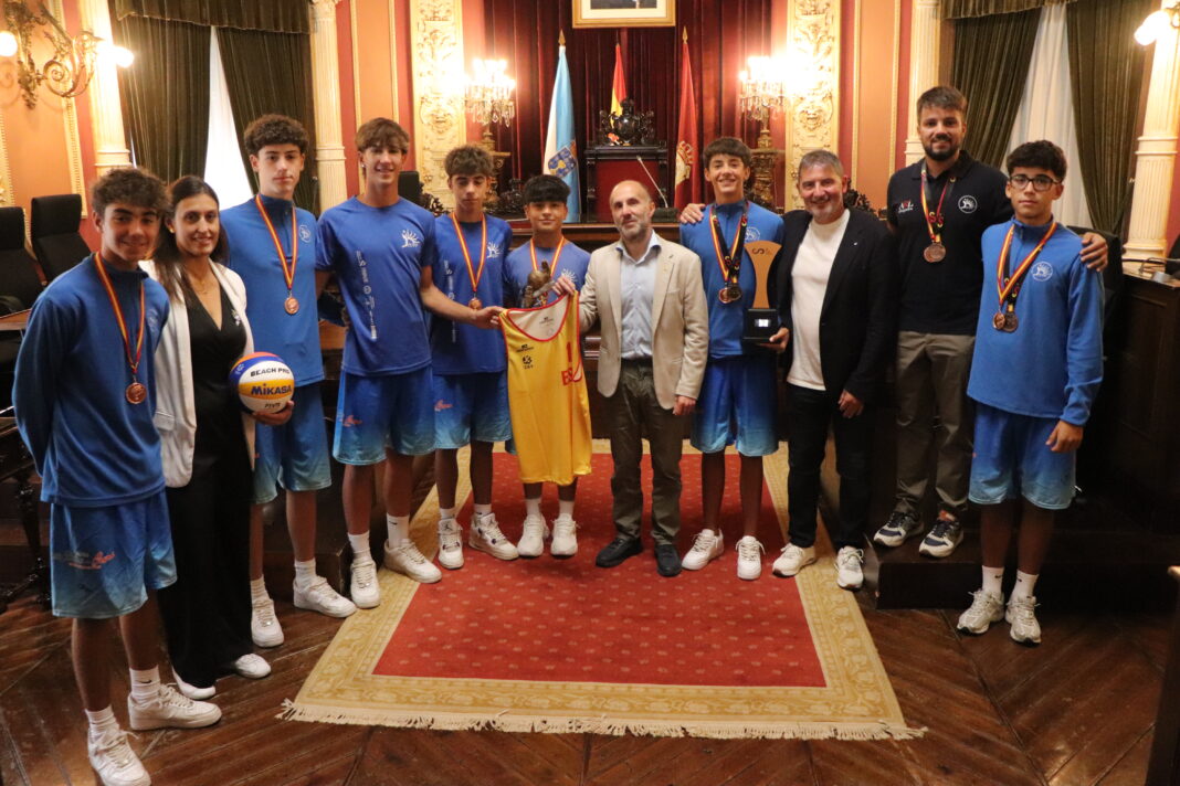 O alcalde de Ourense, Gonzalo Pérez Jácome, o tenente de alcalde, Aníbal Pereira, e a concelleira de Xuventude, Tamara Silva, recibiron esta mañá no salón de plenos do Concello o director técnico, Álex Prada, e xogadores do Club Ourense Volei Praia, aos que felicitaron polos excelentes resultados obtidos durante a última tempada.