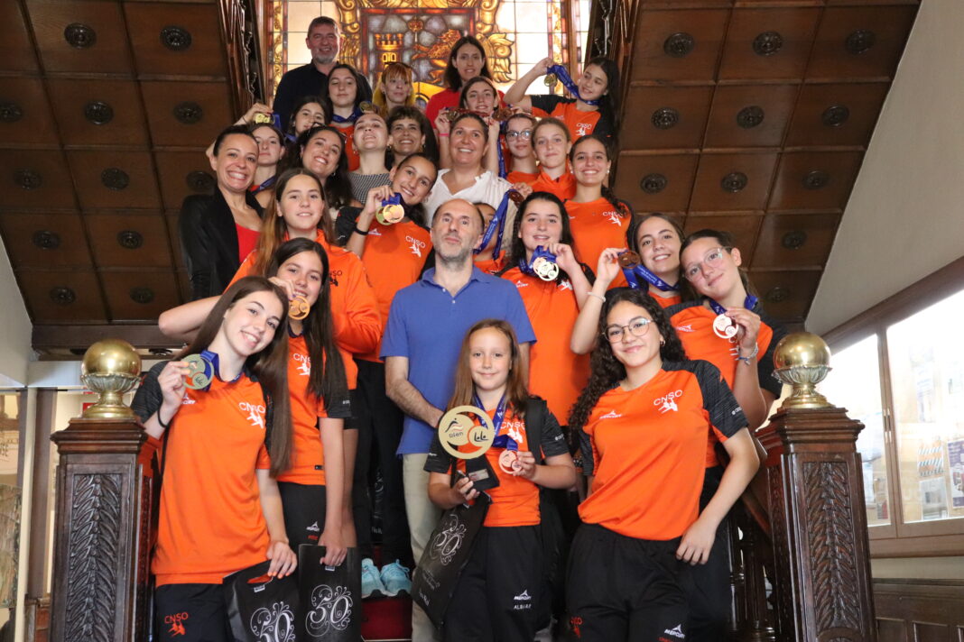O alcalde de Ourense, Gonzalo Pérez Jácome, e concelleiros do goberno municipal recibiron no salón de plenos o equipo do CN Sincro Ourense, que participou a finais do mes de xuño no Campionato de España de natación artística das categorías alevín e infantil que se disputou na piscina municipal Rosario Dueñas e a semana pasada no campionato estatal das categorías júnior e absoluta.