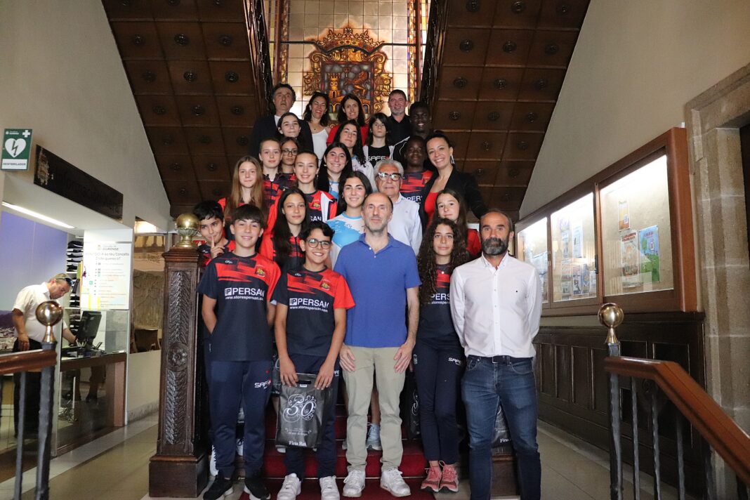 O alcalde de Ourense, Gonzalo Pérez Jácome, e concelleiros do goberno municipal recibiron esta mañá no salón de plenos o Club Atletismo Ourense Sub14, masculino e feminino, que subiron ao podio no campionato galego recentemente disputado na súa categoría, e as 3 atletas ourensáns que competiron coa selección galega absoluta: Manuela Blanco (na modalidade de salto con pértega), Blanca Pereira (lanzamento de martelo) e María Ezquerro (lanzamento de disco).