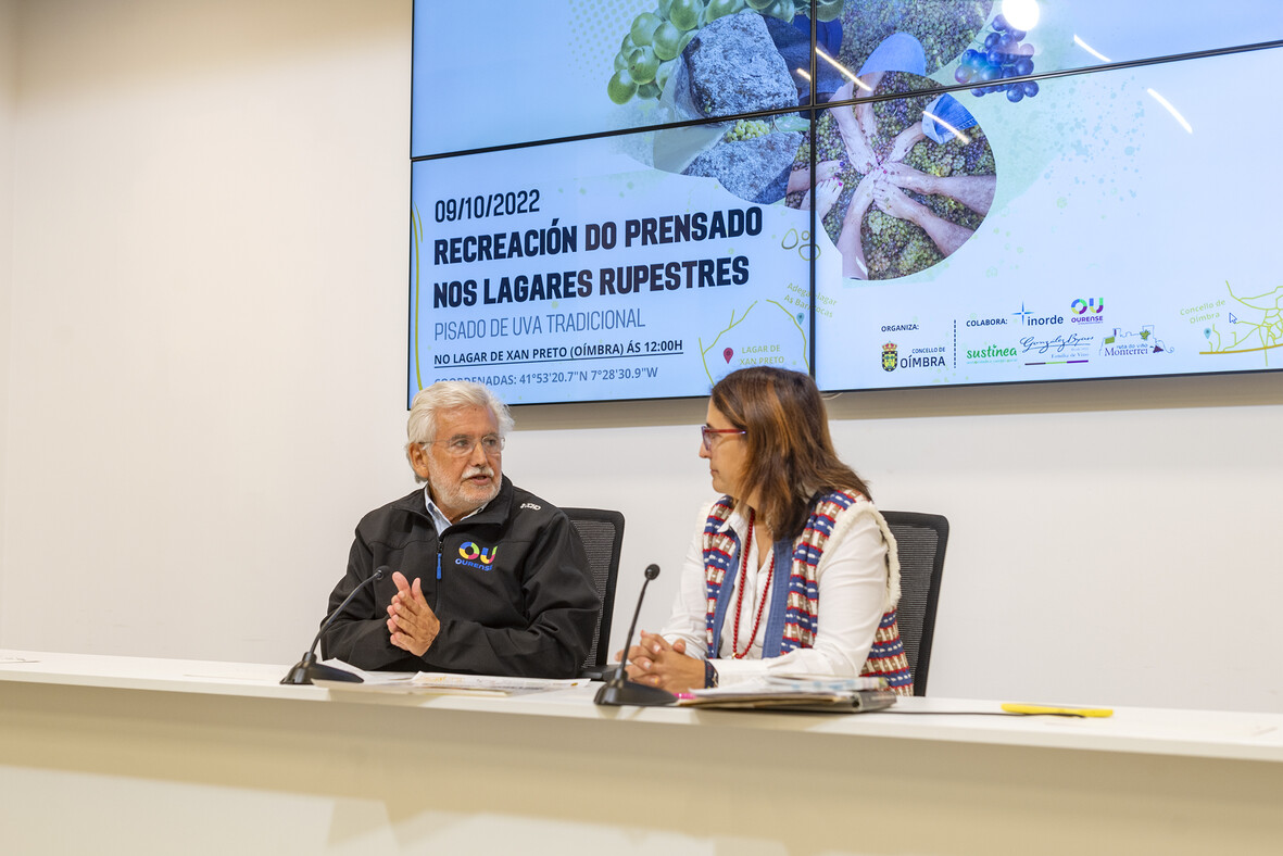 O municipio de Oímbra rememora a súa tradición e historia retrocedendo ao medievo coa recreación do prensado nos seus lagares rupestres co xa tradicional pisado de uvas que terá lugar o vindeiro domingo, 9 de outubro. A presentación da iniciativa tivo lugar hoxe na sala de prensa do Pazo Provincial, acto no que participou o presidente do Inorde, Rosendo Fernández, e a alcaldesa de Oímbra, Ana Villarino.