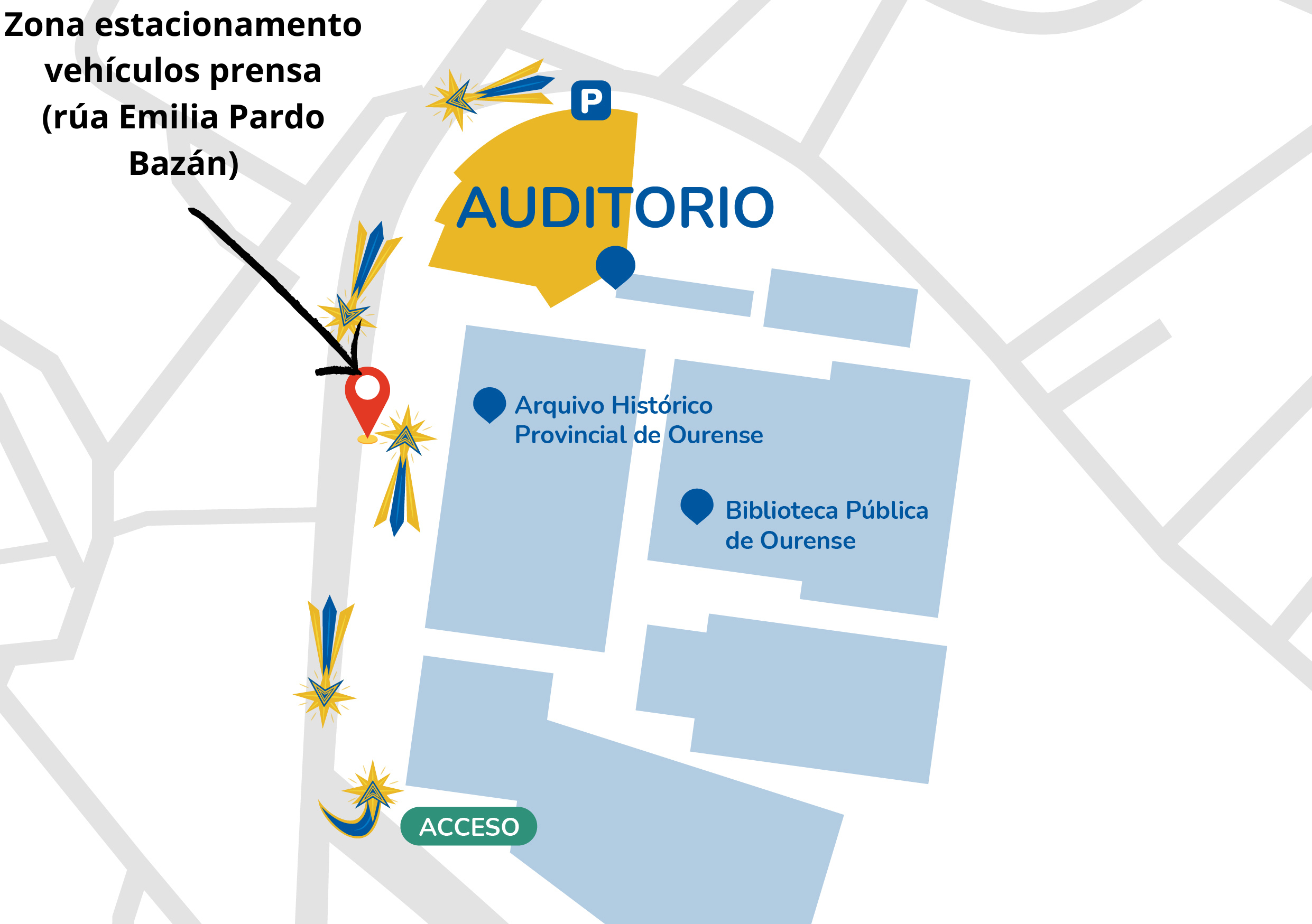 A entrada ao recinto deberase efectuar pola parte traseira do Auditorio, a través dunha pasaxe elaborada para a ocasión, ao carón do Arquivo Histórico Provincial.