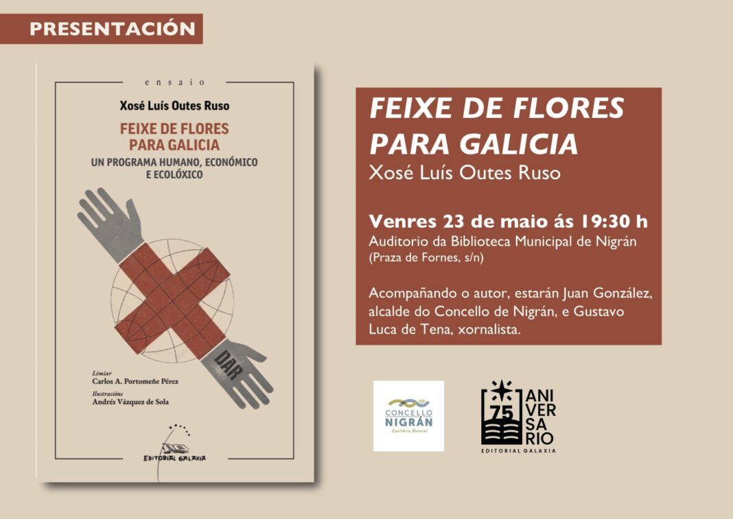 A Biblioteca Municipal de Nigrán acolle este venres 23 de maio ás 19:30 horas a presentación do libro de ensaio de Xosé Luís Outes ‘Feixe de flores para Galicia. Un programa humano, económico e ecolóxico’ (Editorial Galaxia, 2025). O autor, veciño de Priegue e catedrático xubilado da Universidade de Vigo, onde impartíu Macroeconomía ou Comercio Internacional, foi tamén fundador e director do Observatorio Socioeconómico da Fundación Pro Vigo (OSEVA) entre 1995 e 2010. O acto estará presentado polo alcalde, Juan González, e o xornalista Gustavo Luca de Tena.