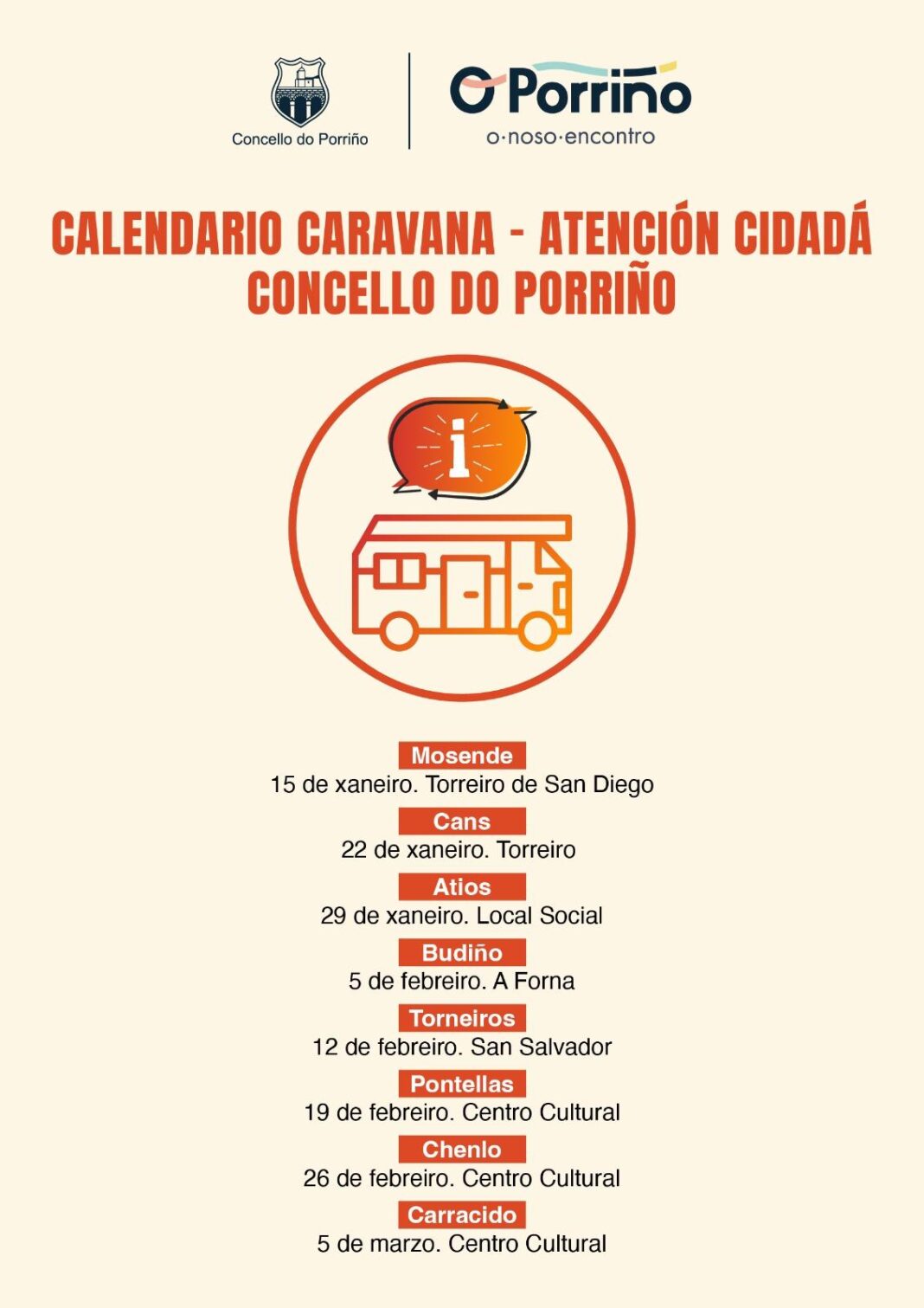 O vindeiro mércores 15 de xaneiro arranca de novo a oficina municipal móvil do Concello do Porriño para achegar a administración local á vecinanza do rural. Un servizo pioneiro co que o Concello do Porriño reafirma o seu compromiso coa atención directa e cercana aos veciños e veciñas.