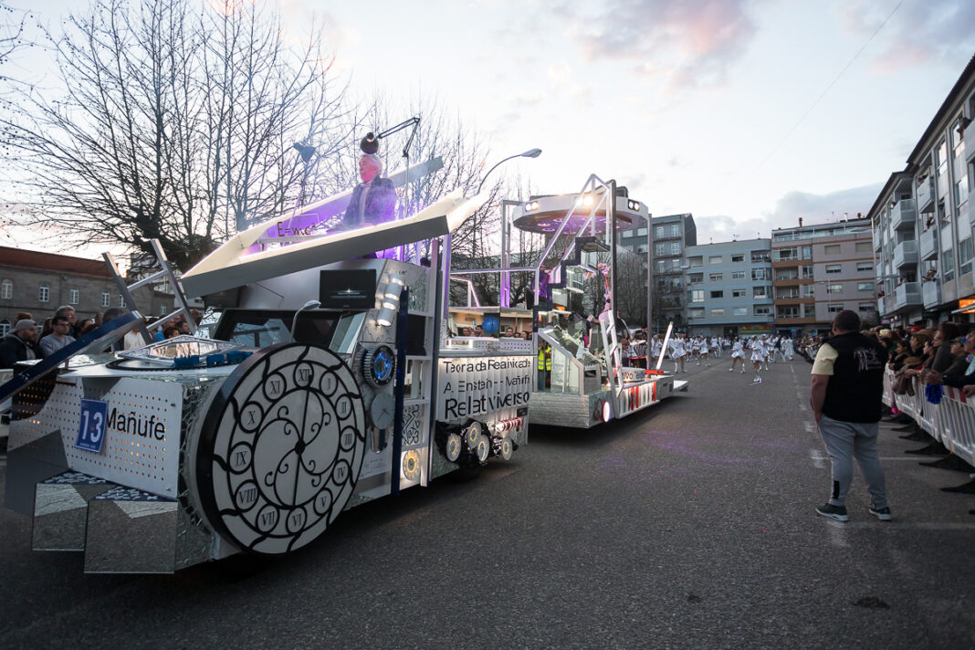A comparsa “Relativerso” da Asociación Carvales de Mañufe foi a gañadora absoluta do desfile-concurso levando amais o segundo premio en carrozas e o premio de música. O case centenar de compoñentes da comparsa presentaron unha proposta inspirada na teoría da relatividade de Albert Einstein, unindo ciencia e arte nunha viaxe visual e conceptual, tomando coma referencia a paleta Pantone de “2001. Unha odisea no espazo” de Stanley Kubrick e cunha escenografía, inspirada nos espazos imposibles de Maurits Cornelis Escher e nos reloxos brandos de Salvador Dalí.