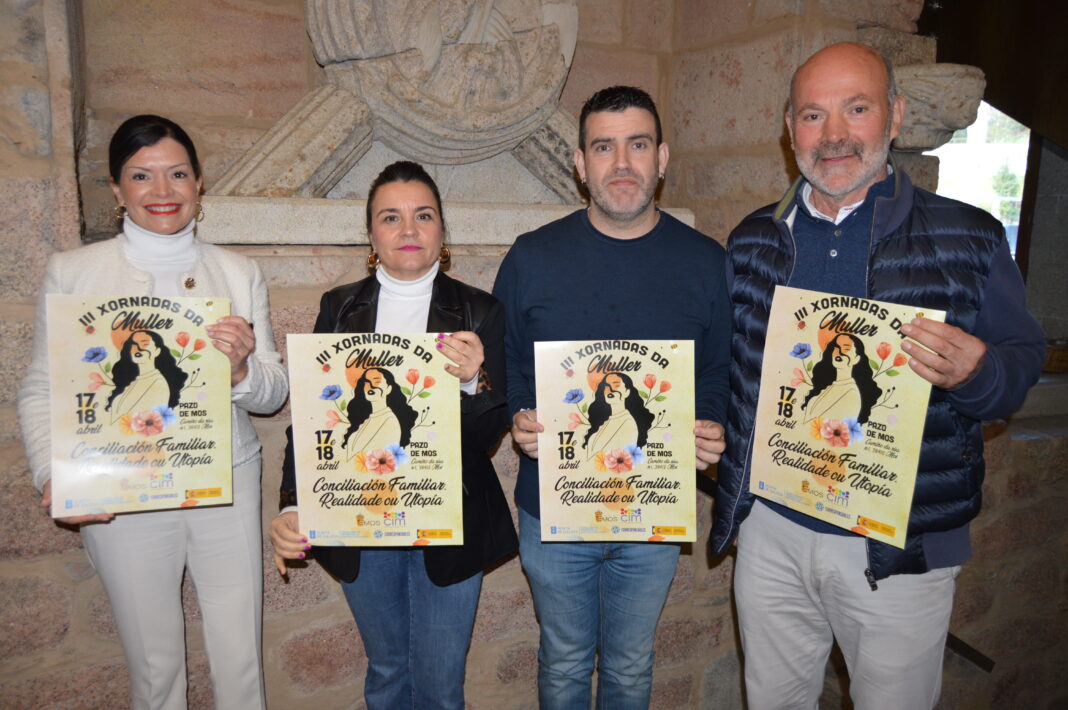 A alcaldesa de Mos, Nidia Arévalo, o seu tenente de alcaldesa, Camilo Grandal, o concelleiro de Igualdade mosense, Leo Costas, e a Xurídica do CIM de Mos, Ana María Rodríguez Cabaleiro, veñen de presentar as III Xornadas da Muller de Mos que se celebrarán os próximos días 17 e 18 de abril no Pazo de Mos en horario de 16.30 a 20 horas e baixo o título CONCILIACIÓN FAMILIAR: REALIDADE OU UTOPÍA.