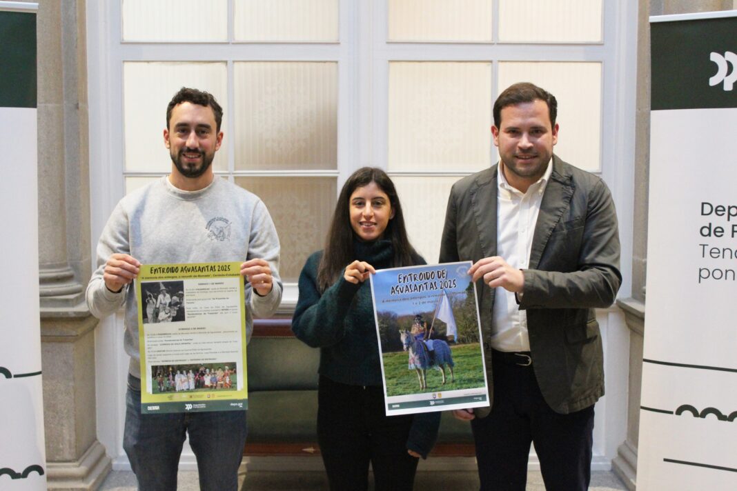O deputado de Cultura e tamén alcalde de Cerdedo-Cotobade, Jorge Cubela, xunto con integrantes da Asociación Cultural Entroido de Aguasantas presentaron a primeira edición trala recuperación desta tradición, que se celebrará os días 1 e 2 de marzo nesta parroquia