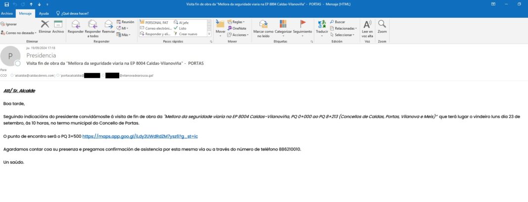 A Deputación desminte que o alcalde de Caldas de Reis non fora convidado ao acto na EP-8004 celebrado este mesmo luns no concello de Portas e insta a que pida desculpas polas falsas acusacións e descualificacións vertidas aos medios de comunicación. A deputada de Infraestruturas Públicas, Mobilidade e Contratación, Isabel Couselo, asegurou que “o pasado xoves 19 de setembro foi enviado un correo electrónico ao alcalde de Caldas (alcaldia@caldasdereis.com) para convidalo á visita de remate das obras da estrada provincial entre Caldas e Vilanoviña, ao igual que fixemos de xeito simultáneo cos alcaldes de Portas e Vilanova e a alcaldesa socialista de Meis, Marta Giráldez, que si estivo no acto”.