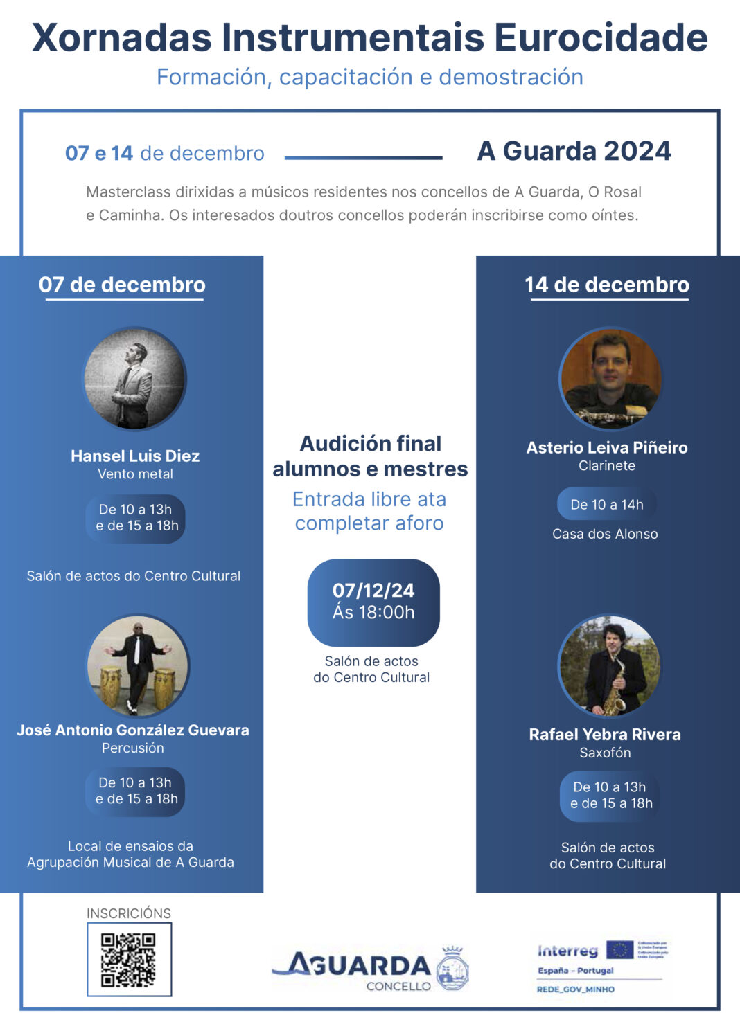 O Concello da Guarda, a través da Agrupación Musical da Guarda ofrecerá no mes de decembro ata catro masterclass impartidas polos mestres dos conservatorios de Vigo e A Coruña: Hansel Luis Díez, José Antonio González Guevara, Asterio Leiva Piñeiro e Rafael Yebra. As clases que se desenvolverán durante os días 7 de decembro e 14 de decembro van destinadas aos músicos residentes dos concellos da Guarda, o Rosal e Caminha, estando aberta a posibilidade de inscribirse como oíntes, interesados doutros concellos.