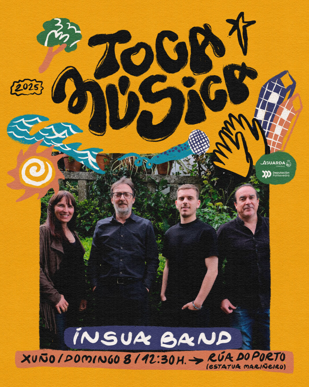 O concerto de Ínsua Band comezará ás 12:30h este domingo 8 de xuño na rúa do Porto, á altura do monumento do mariñeiro.