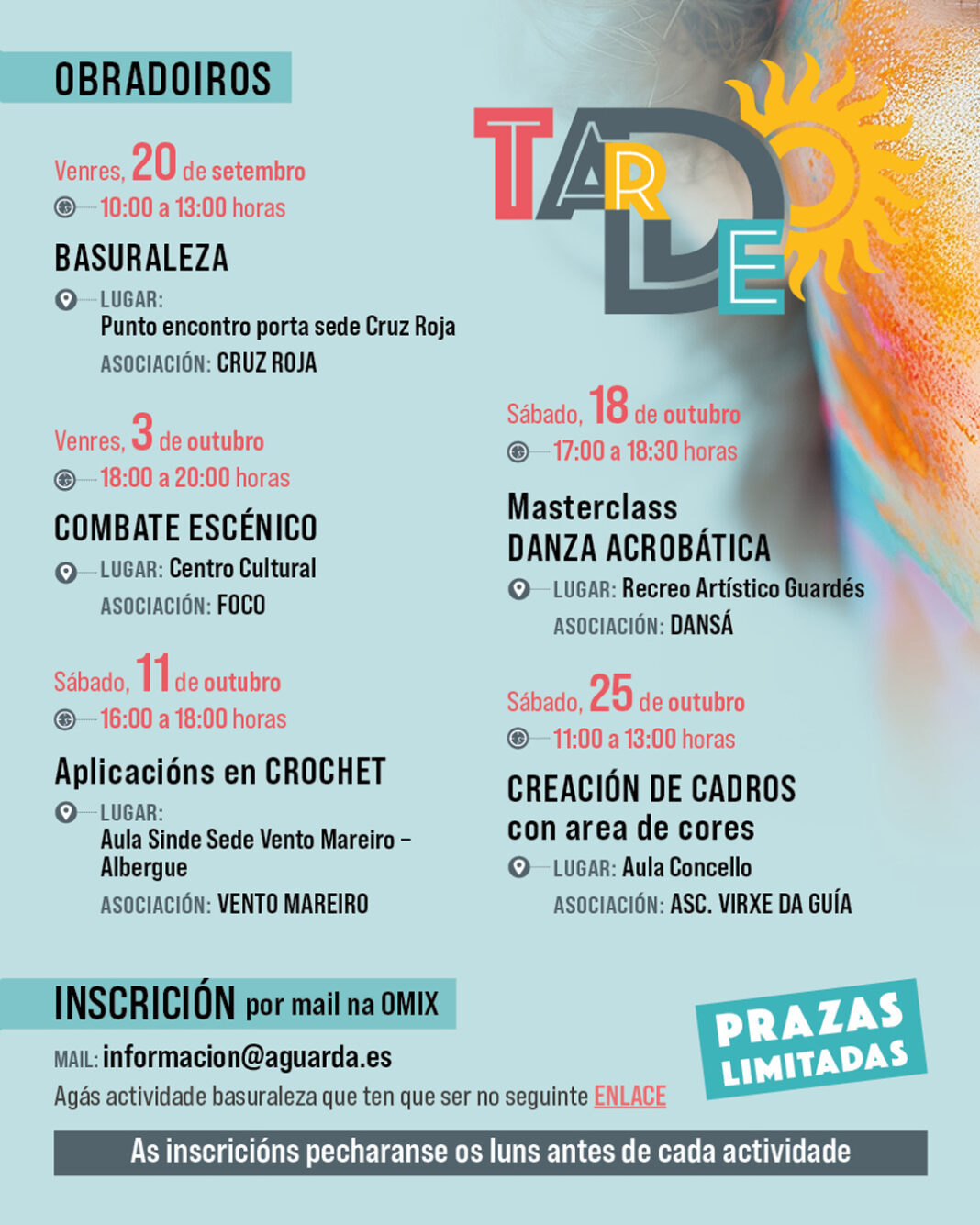 Para a inscrición nunha ou en varias das actividades, só hai que mandar un correo electrónico a informacion@aguarda.es co nome, teléfono, mail e as actividades nas que se quere participar por orde de preferencia. As inscricións pechan os luns antes de cada actividade.