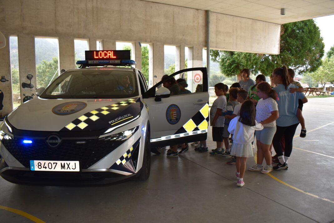 O campamento municipal “Mañás de Verán” recibiu esta mañá unha visita moi especial: tres vehículos patrulla da Policía Local de Mos e tres axentes que, máis aló do seu uniforme, chegaron co obxectivo de achegarse aos nenos e nenas de maneira didáctica e divertida. A esa visita tamén asistiu a concelleira de Educación Julia Loureiro.