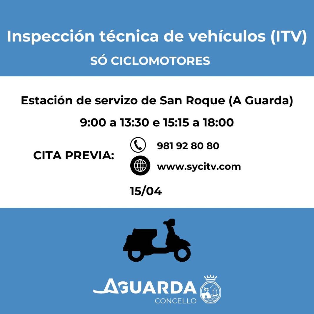O mércores 15 de abril realizaranse inspeccións técnicas de CICLOMOTORES en horario de 9:00 a 13:30 horas e de 15:15 a 18:00 horas.