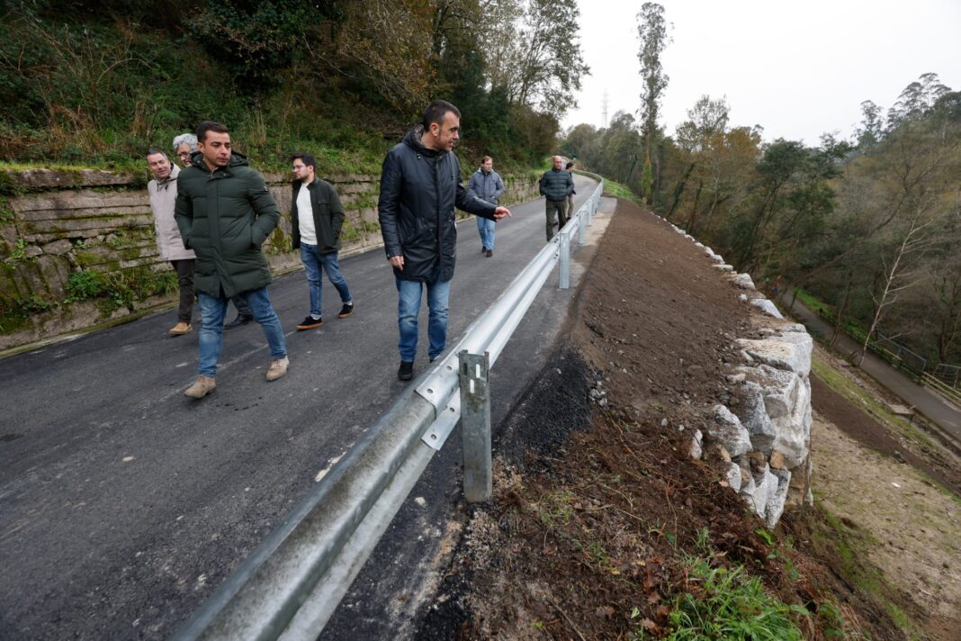 O concelleiro Xaquín Moreda visitou esta mañá o remate da obra que tamén incluíu a canalización do importante caudal de augas pluviais que proceden do barrio cara o río Lérez, na parte superior da estrada.