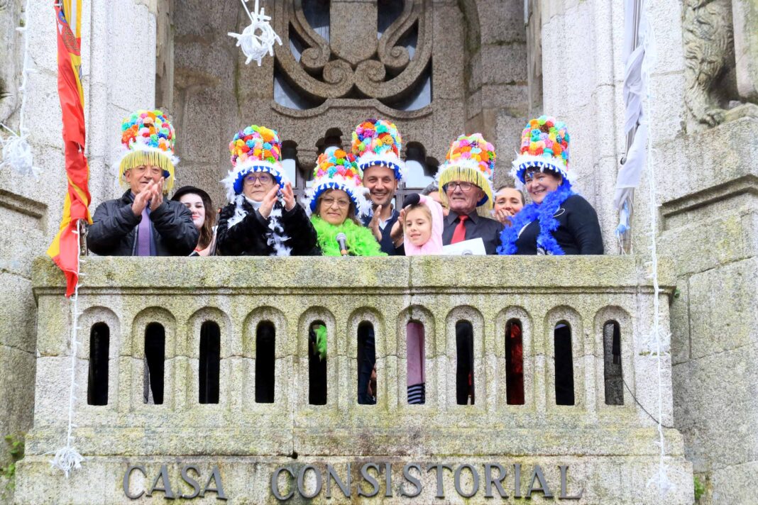Pero non estiveron sós, os/as pregoeiros/as estiveron acompañados no balcón polo alcalde, Alejandro Lorenzo, e a autora do cartel deste Entroido, Carmen Sebastián que foi a encargada de presentalos.