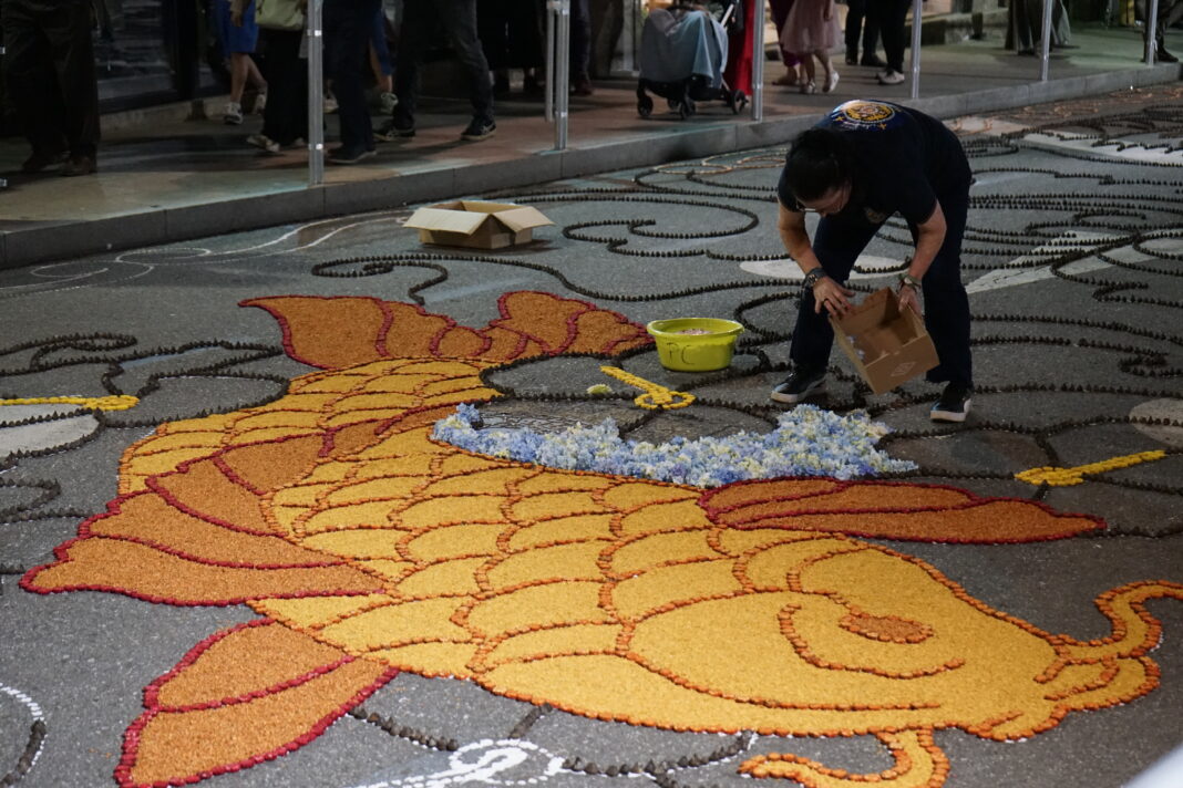 Nos portais alfombristas as veciñas e veciños organízanse para traballar cada tarde. Uns recolleitan, outros desfollan, outros fan o deseño e todos xuntos confeccionan o tapiz de flores na noite do Corpus que terá lugar do sábado día 21 ao domingo día 22.