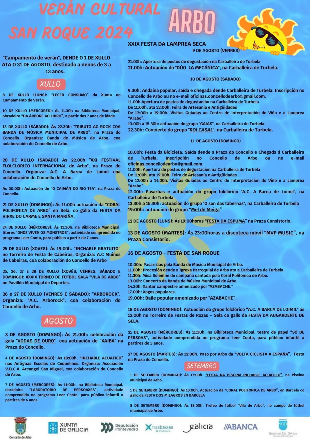 O Concello de Arbo, presenta o seu Verán Cultural, con cuarenta actividades, encamiñadas a formentar a participación dos vecinos e veciñas de Arbo e potenciar o turismo coa chegada de visitantes durante estos meses de verán.