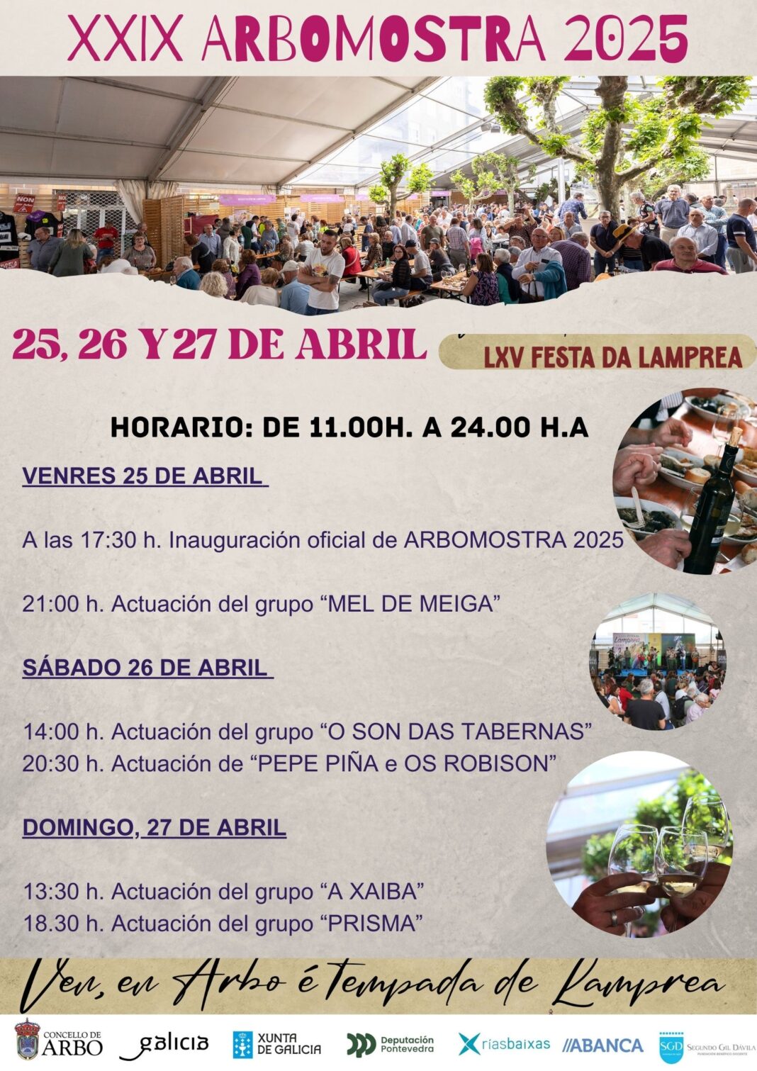 • Os días 25, 26 e 27 de abril, acercate a Arbo e visita Arbomostra, onde poderás degustar a lamprea acompañada dos viños con D.Ou Rías Baixas, mentres gozas dunha programación cultural ampla e exclusiva.