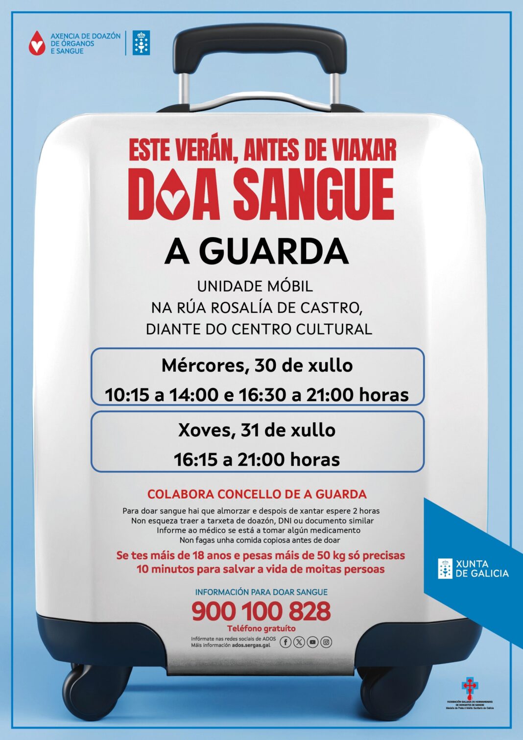 A unidade móbil estará o mércores 30 de xullo de 10:15 a 14:00 horas en horario de mañá, e de 16:30 a 21:00 horas, en horario de tarde. O xoves 31 de xullo só se poderá doar no horario de tarde.