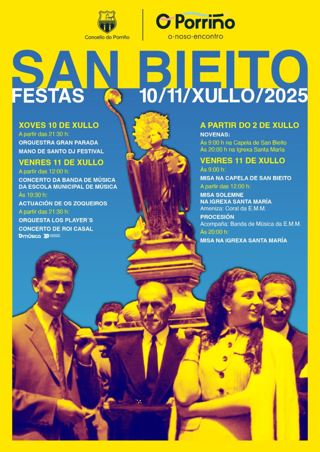 Ademais, dende o día 2 de xullo hai novenas ás 9:00 h na Capela de San Bieito e ás 20:00 h na Igrexa de Santa María. - O Concello do Porriño convida a toda a cidadanía a participar activamente nestas festas, agradecendo a colaboración da Asociación de Veciños de San Benito e San Sebastián e de todas as entidades que fan posible esta celebración ano tras ano.