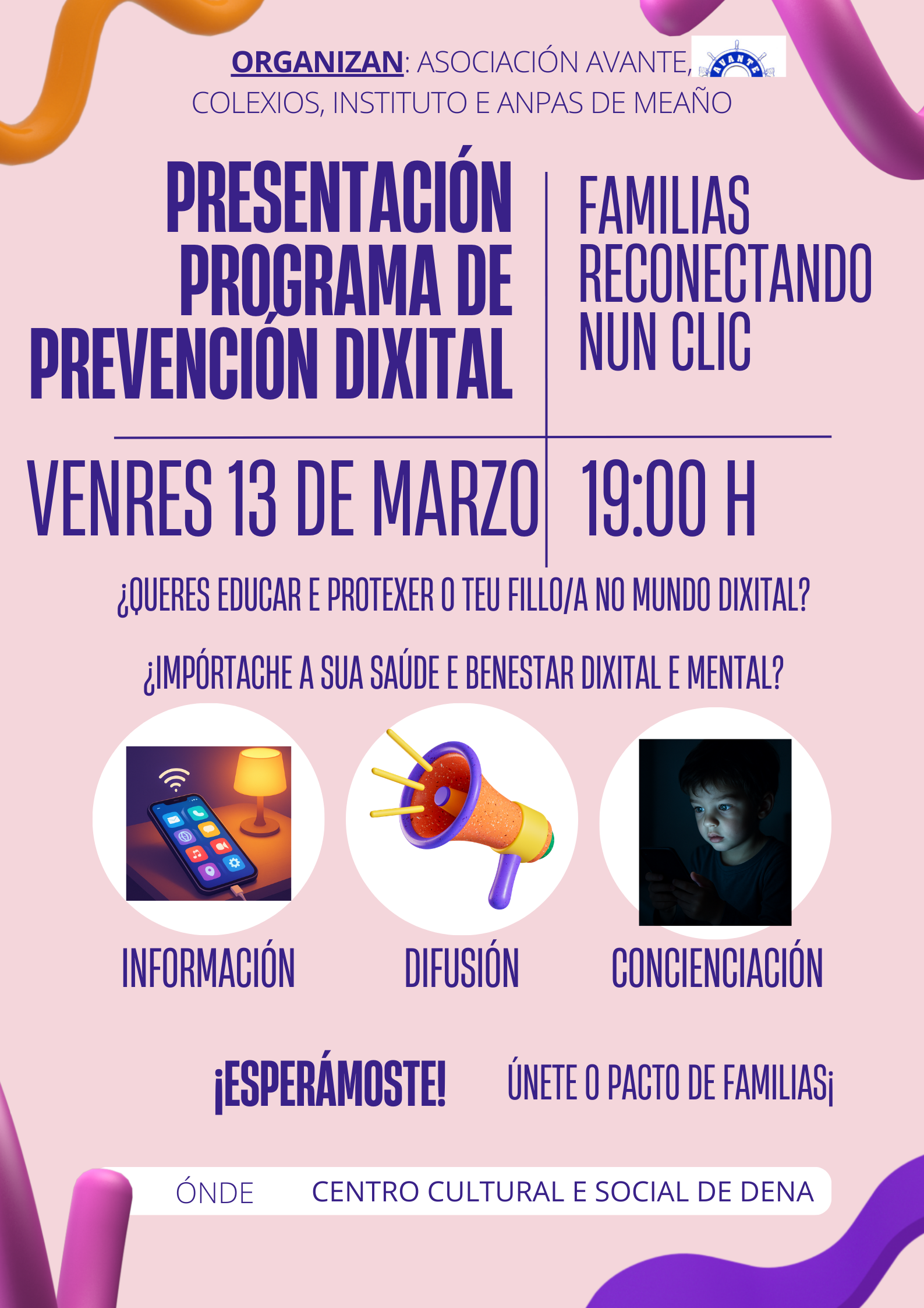 A crecente dependencia das pantallas desde idades cada vez máis temperás mobilizou á comunidade educativa de Meaño. A Asociación Avante —con máis de tres décadas de experiencia na prevención de condutas aditivas— uniu forzas co IES de Meaño, os CEIP As Covas e Coirón de Dena, e as súas respectivas asociacións de nais e pais para lanzar o programa “Familias Reconectando nun Clic”. A iniciativa presentarase de forma oficial este vindeiro venres, 13 de marzo, ás 19:00 horas no Centro Social e Cultural de Dena.