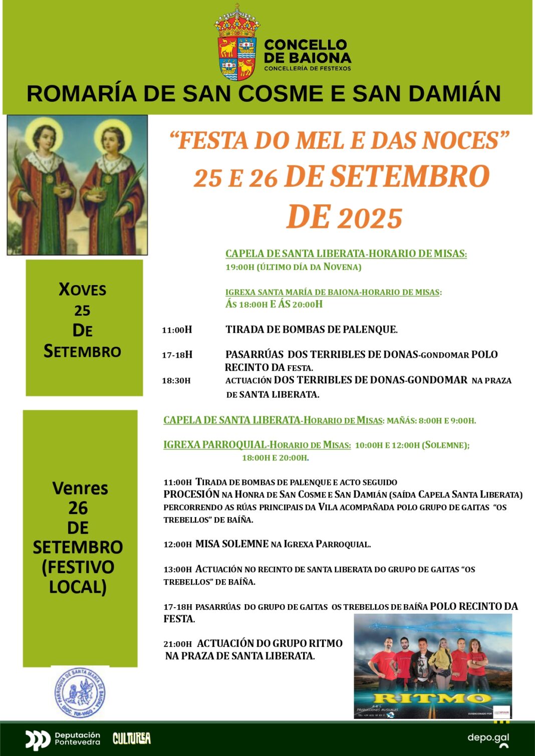Mañá xoves día 25 e o venres día 26 de setembro, este último festivo local, Baiona celebra a tradicional Romaría de San Cosme e San Damián 2025, máis coñecida popularmente pola Festa do mel e as noces.