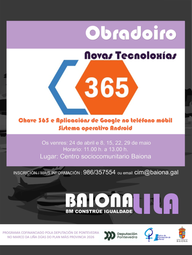A Concellaría de igualdade do Concello de Baiona, a través do CIM, organiza no marco do programa de novas tecnoloxías que está a desenvolver, o curso “Chave 365 e aplicacións de Google non teléfono móbil”.