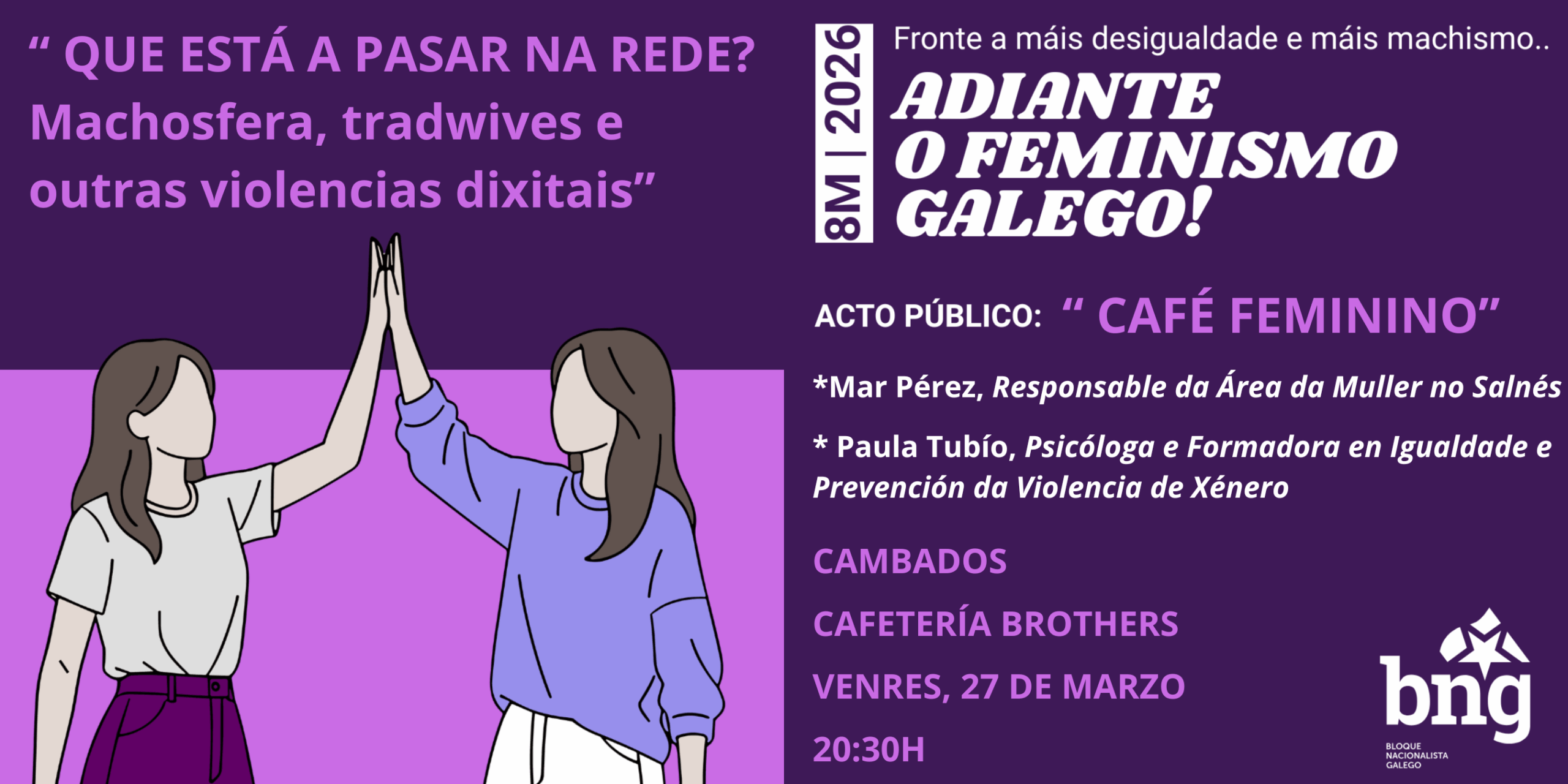 O BNG do Salnés continúa coa súa programación de actividades arredor do 8 de Marzo, Día Internacional da Muller Traballadora, coa organización dun acto público baixo o formato de “Café feminino”, un espazo de encontro e reflexión sobre os retos actuais do feminismo.