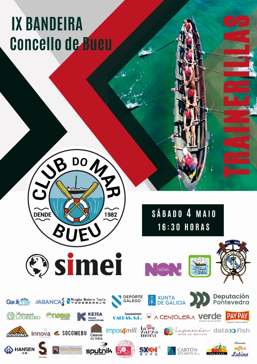 Bueu acollerá o próximo sábado, 4 de maio, a regata IX Bandeira de Traineriñas, unha proba organizada polo Club do Mar Bueu Simei e o Concello de Bueu, que se poderá seguir dende o peirao da vila a partir das 16.30 horas e na que participarán un total de 41 embarcacións pertencentes a once clubs. Así se anunciou na rolda de prensa celebrada este xoves, na que estiveron presentes Félix Juncal, alcalde de Bueu, Silvia Carballo, concelleira de promoción económica e turismo, e Javier Pazos, da directiva do Club do Mar Bueu Simei.