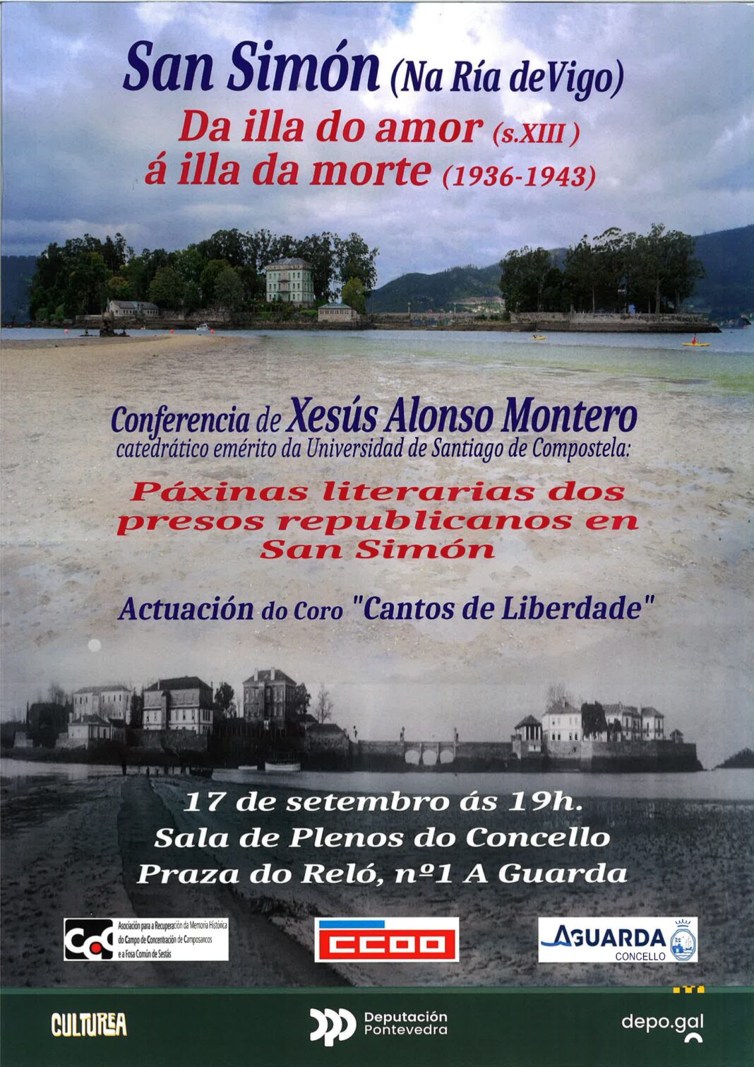 A sesión estará guiada por Xesús Alonso Montero, catedrático emérito da Universidade de Santiago de Compostela. A conferencia leva por nome “Páxinas literarias dos presos republicanos en San Simón”, centrándose a sesión nesta illa da ría de Vigo.