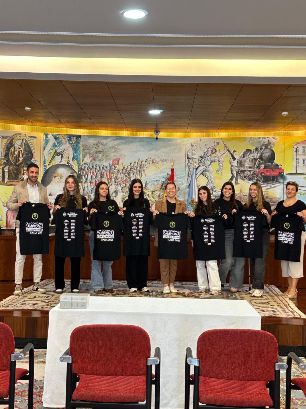 A Alcaldesa acompañada do Concelleiro de Deportes, fixeron entrega dunhas camisetas conmemorativas do éxito para todo o grupo.