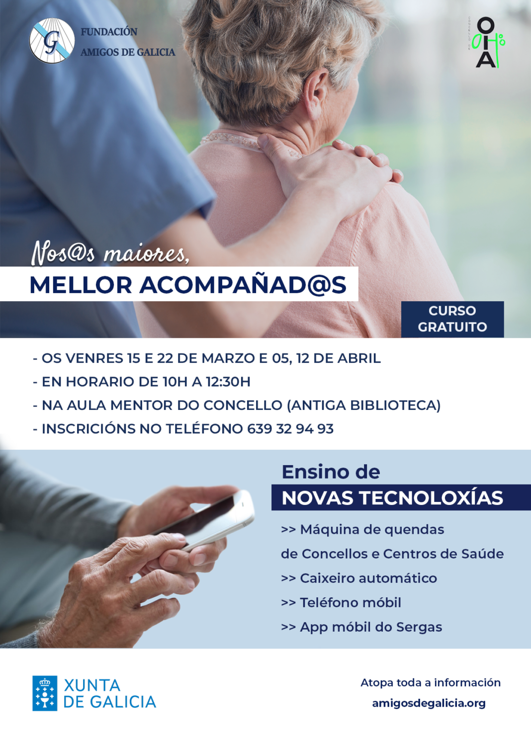 O programa “Mellor Acompañad@s” da Fundación Amigos de Galicia desenvolverase nun total de 4 sesións os venres 15 e 22 de marzo e 5 e 12 de abril. As clases terán lugar na aula mentor (antiga biblioteca municipal, nos baixos da Casa do Concello) en horario de 10.00 a 12.30 horas.