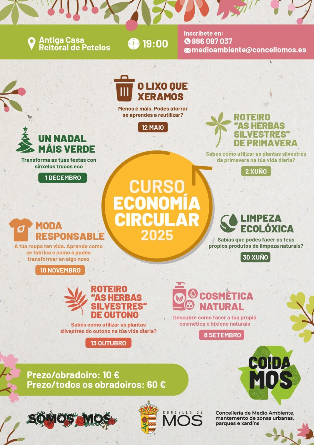 O Concello de Mos, a través da Concellería de Medio Ambiente e dentro da iniciativa CoidaMos, pon en marcha o Curso de Economía Circular 2025, un ciclo de obradoiros prácticos dirixidos á cidadanía co obxectivo de fomentar hábitos sostibles e reducir a pegada ecolóxica no día a día. As actividades desenvolveranse entre os meses de maio e novembro na Antiga Casa Reitoral de Petelos, en horario de 19:00 a 21:00 horas.