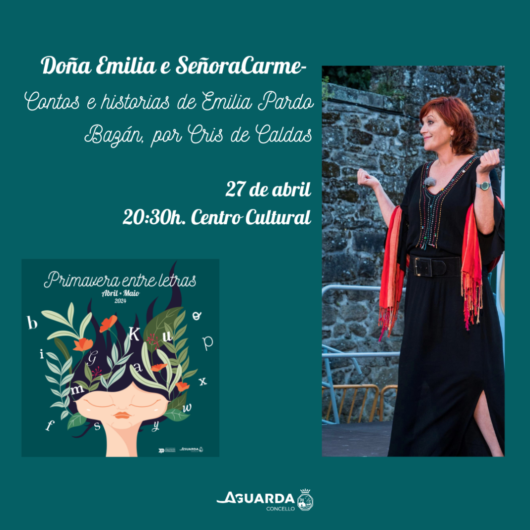 Este sábado 27 de abril ás 20,30h. realizarase no Centro Cultural da Guarda esta proposta na que a narradora Cris de Caldas recupera algúns dos contos de Emilia Pardo Bazán, especialmente aqueles mais relacionados coa cultura e as formas de vida do rural galego a través da voz da súa avoa, a Señora Carme: