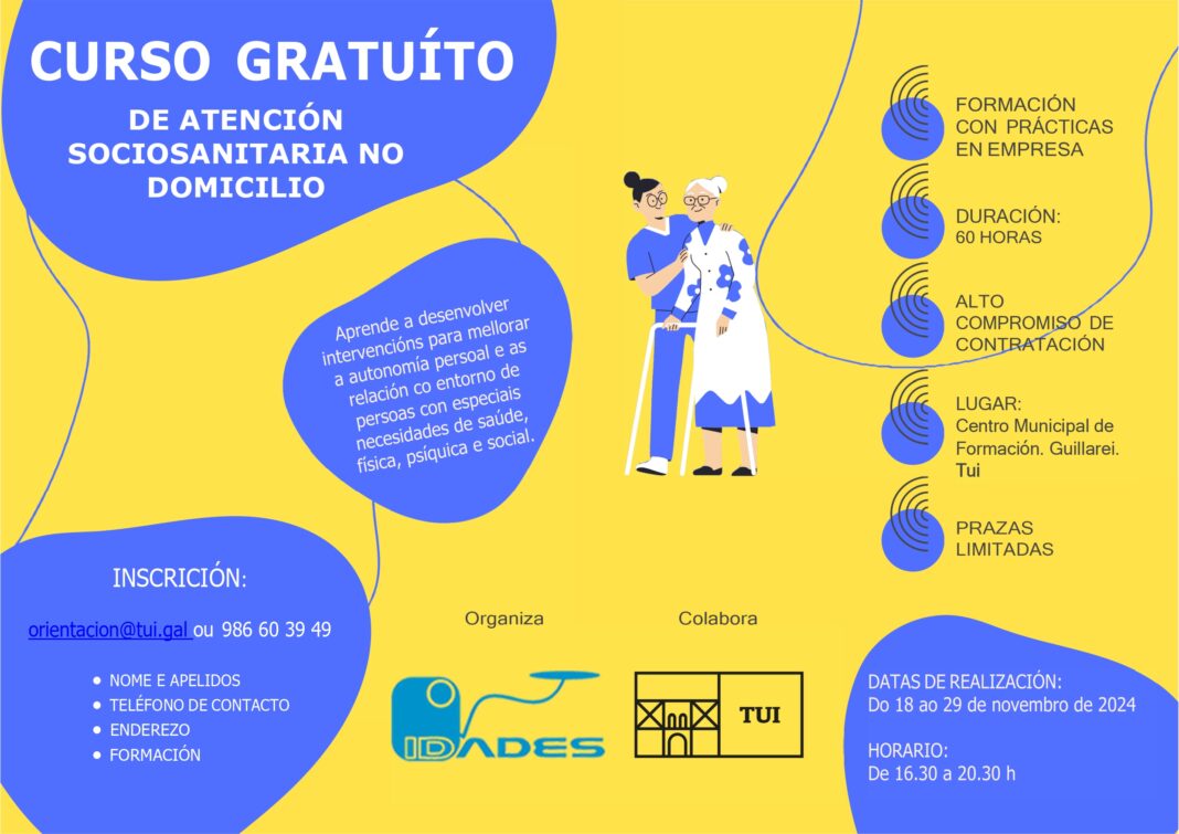 Tui acollerá no mes de novembro un curso gratuíto de “Atención Sociosanitaria no domicilio” froito da colaboración entre o Concello de Tui e a empresa IDADES. Celebrarase do 18 ao 29 de novembro en horario de 16.30 a 20.30 h no Centro Municipal de Formación en Guillarei, cun total de 60 horas lectivas. As persoas participantes no curso realizarán prácticas en empresas.