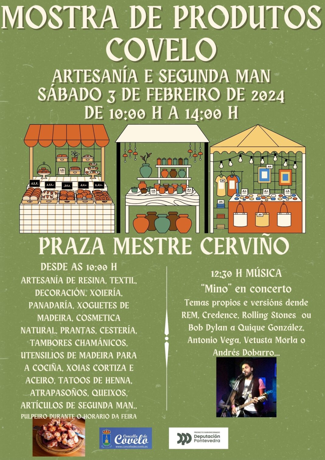 A partir das 12:30 horas actuará Mino para presentarnos temas propios e versións de afamados temas de REM, Credence, Rolling Stones, Bob Dylan ou Quique González, Antonio Vega, Vetusta Morla e Andrés Dobarro.
