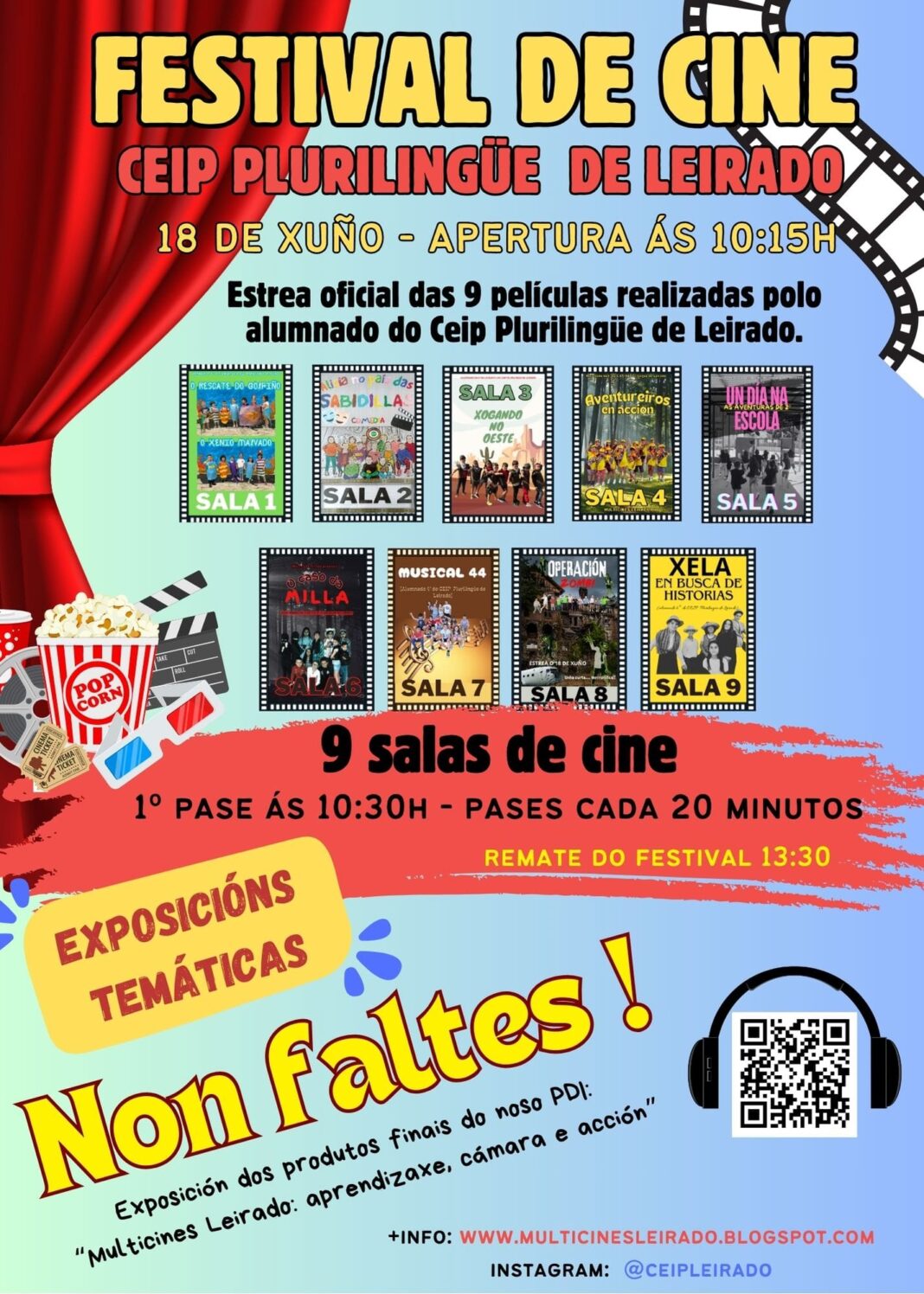 O martes, 18 de xuño, de 10:15 a 13:30 h., no CEIP Plurilingüe de Leirado, como peche das actividades lectivas no centro, haberá festival de cine coa proxección de nove curtas elaboradas polo alumnado do centro e unha exposición dos traballos realizados ao longo do curso en relación co proxecto interdisciplinar “Multicines Leirado: aprendizaxe, cámara, acción!”