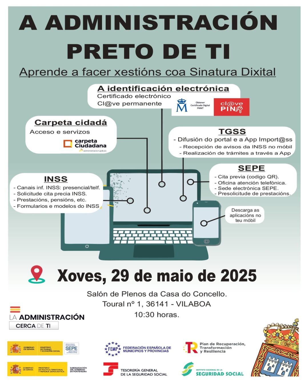 O salón de plenos do Concello de Vilaboa acollerá este xoves día 29, ás 10.30 da mañán, una sesión formativa impartida por funcionarios da Subdelegación do Goberno que prestan servizo nas oficinas de información e atención ao cidadán dentro da campaña “A administración preto de ti”-
