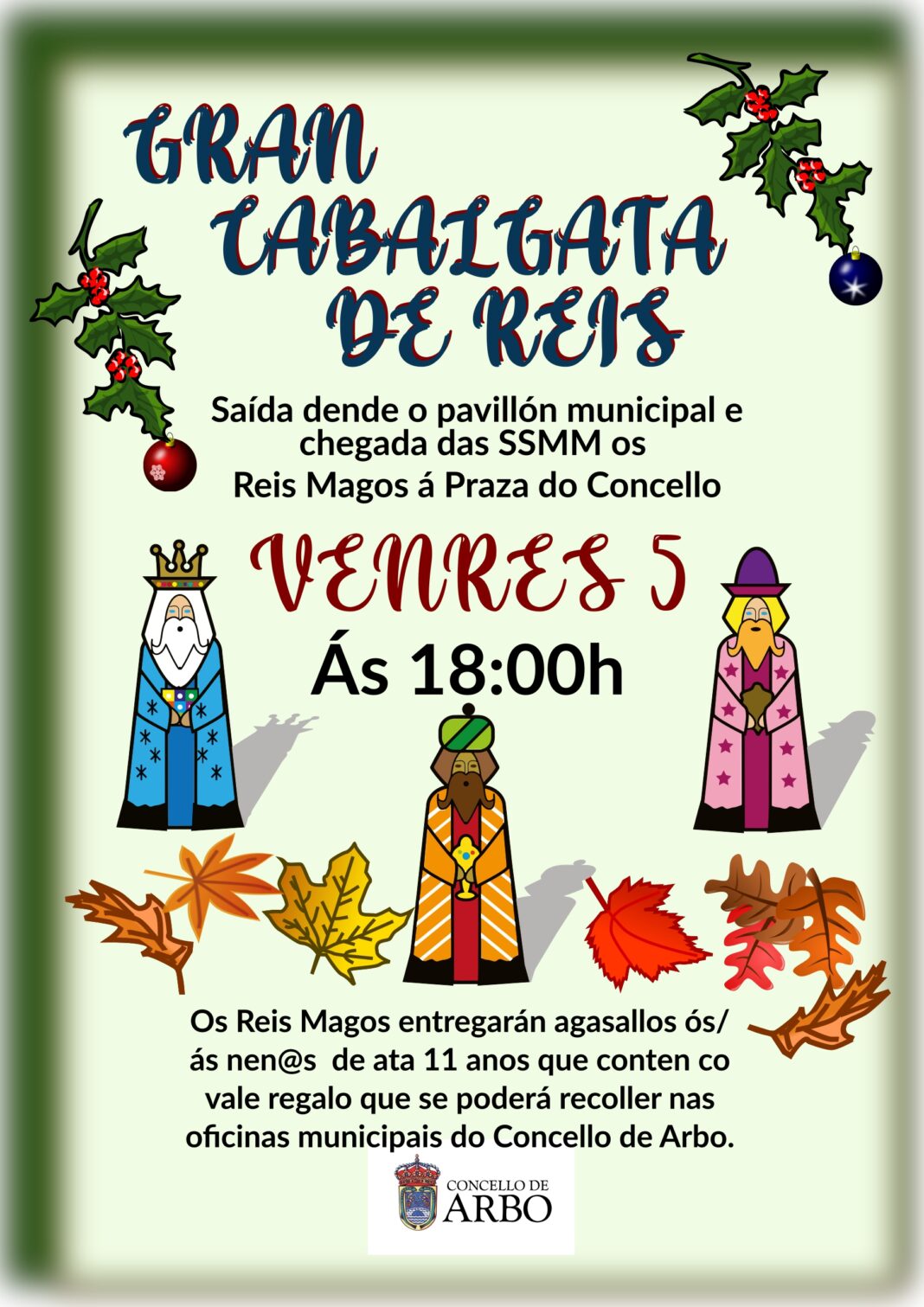 O vindeiro venrés 5 de xaneiro a partir das 18:00 horas, e seguindo coa tradición, as súas maxestades os Reis Magos de Oriente percorrerán as rúas de Arbo e entregarán agallasallos aos nenos e nenas de ata 11 anos de idade que teñan o correspondente vale regalo.