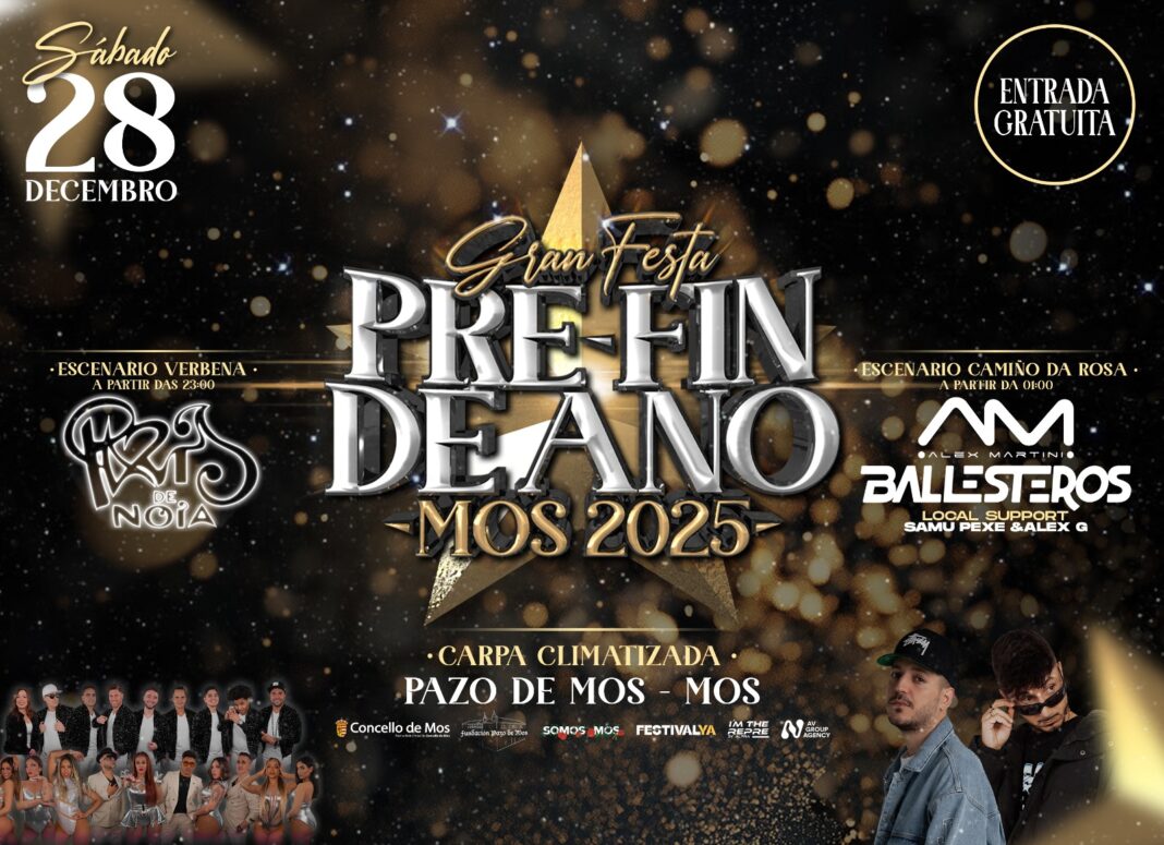 A mellor Festa Pre Fin de Ano do sur da provincia celebrarase no Pazo de Mos o Día dos Santos Inocentes. Un cartel de luxo cos mellores DJs do país e unha das mellores orquestras de Galicia darase cita o 28 de decembro a partir das 23.00 horas con dous escearios e carpa climatizada. Referentes da escea musical galega e española compartirán esceario en Mos.