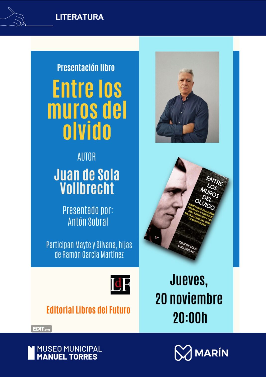 O Museo Torres de Marín acollerá este xoves, 20 de novembro, ás 20.00 horas, a presentación do libro “Entre los muros del olvido”, escrito polo xornalista Juan de Sola e que rescata a historia persoal e colectiva dun veciño de Campañó, que sobreviviu aos horrores do campo nazi de Mauthausen.