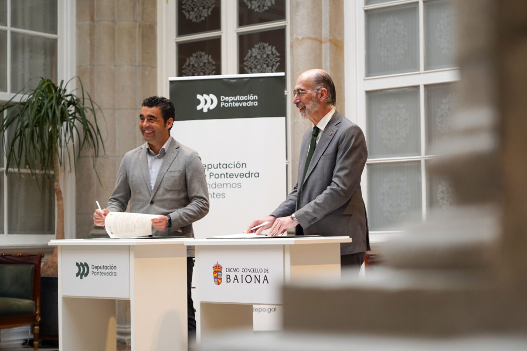 O presidente da Deputación de Pontevedra, Luis López, vén de asinar o convenio de colaboración co alcalde de Baiona, Jesús Vázquez Almuíña, para o financiamento do proxecto de reurbanización da Praza de Santa Liberata. Un acordo asinado no marco do Plan Extra, o novidoso plan de investimentos do goberno provincial que mobiliza ata 38 millóns de euros entre os concellos de menos de 50.000 habitantes da provincia para executar proxectos estratéxicos. No Pazo provincial, López e Vázquez Almuíña selaron un acordo a través do cal o a Deputación financia o 100 % do orzamento, de case 1,4M€; cunha achega de 900.000€ ao abeiro deste Plan Extra e outra de 493.570€ para cubrir a parte correspondente ao Concello con recursos do Plan + Provincia.