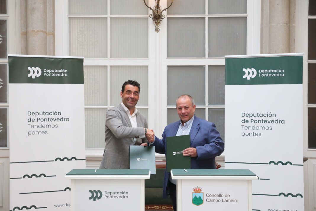 O presidente da Deputación de Pontevedra, Luis López, vén de asinar o convenio de colaboración co alcalde de Campo Lameiro, Carlos Costa, para a reforma urbana e humanización do Camiño Agrelo. Un acordo asinado no marco do Plan Extra, o novidoso plan de investimentos do goberno provincial que mobiliza ata 38 millóns de euros entre os concellos de menos de 50.000 habitantes da provincia para executar proxectos estratéxicos. No Pazo provincial, López e Costa selaron un acordo a través do cal o organismo provincial financia o 100 % dun proxecto valorado en máis de medio millón de euros cunha achega de 450.000€ a través do Plan Extra e co aporte de 78.200€ para cubrir a parte correspondente ao Concello a través do Plan +Provincia. “Falamos dunha zona de tránsito que aglutina gran parte dos servizos, de ámbito deportivo, educativo e sanitario. Ampliaremos unha rúa moi pequena que dará solución tamén ao saneamento. Unha obra financiado ao 100 % pola Deputación.”, afirmou o presidente Luis López.