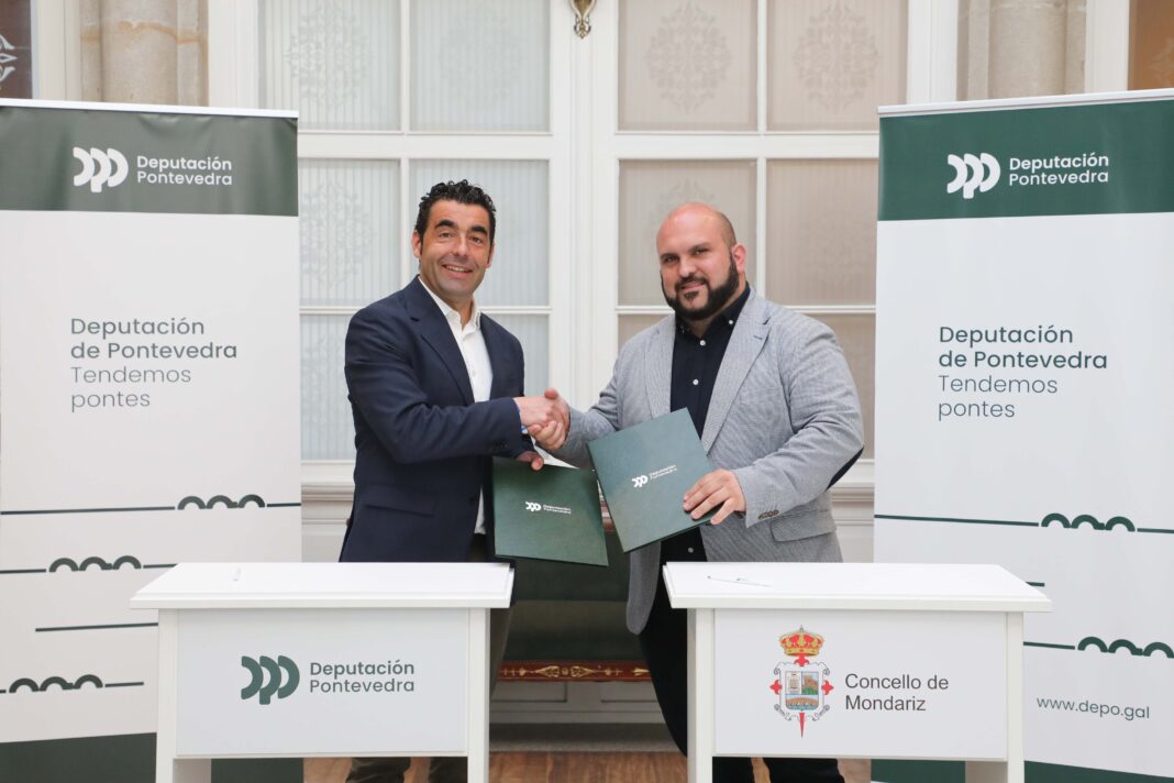 O presidente da Deputación de Pontevedra, Luis López, vén de asinoar o convenio de colaboración co alcalde de Mondariz, Pablo Barcia, para o financiamento do proxecto de acondicionamento e mellora do pavillón municipal. Un acordo asinado no marco do Plan Extra, o novidoso plan de investimentos do goberno provincial que mobiliza ata 38 millóns de euros entre os concellos de menos de 50.000 habitantes da provincia para executar proxectos estratéxicos. No Pazo provincial, López e Barcia selaron un acordo a través do cal o organismo provincial achega o 100% do orzamento necesario, 498.718 euros, dos cales 424.000 euros proceden dos fondos do Plan Extra e 74.800 euros dos recursos do Plan +Provincia.