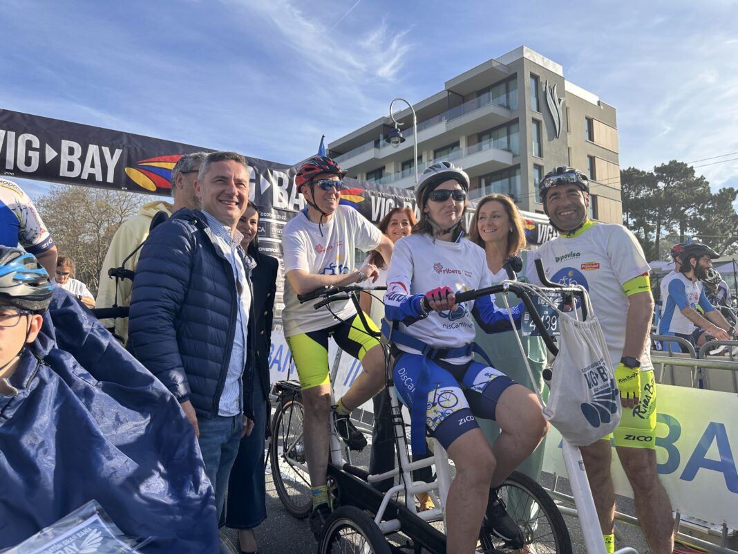 O presidente da Deputación de Pontevedra, Luis López, e o presidente da Xunta de Galicia, Alfonso Rueda, acompañaron este domingo aos usuarios do colectivo Discamino na modalidade ciclista da carreira Vig-Bay, unha marcha multitudinaria que une cada ano as cidades de Vigo e Baiona.