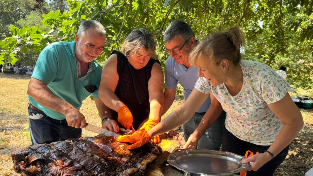 As mesas colocadas baixo ás árbores do Parque Arqueolóxico da Arte Rupestre (PAAR) serviron de acubillo para que os asistentes disfrutaran comodamente dos espetos que ao redor das 15 horas ían saíndo das braxas preparadas polos membros da Asociación Costillar A Estaca de San Clemente.
